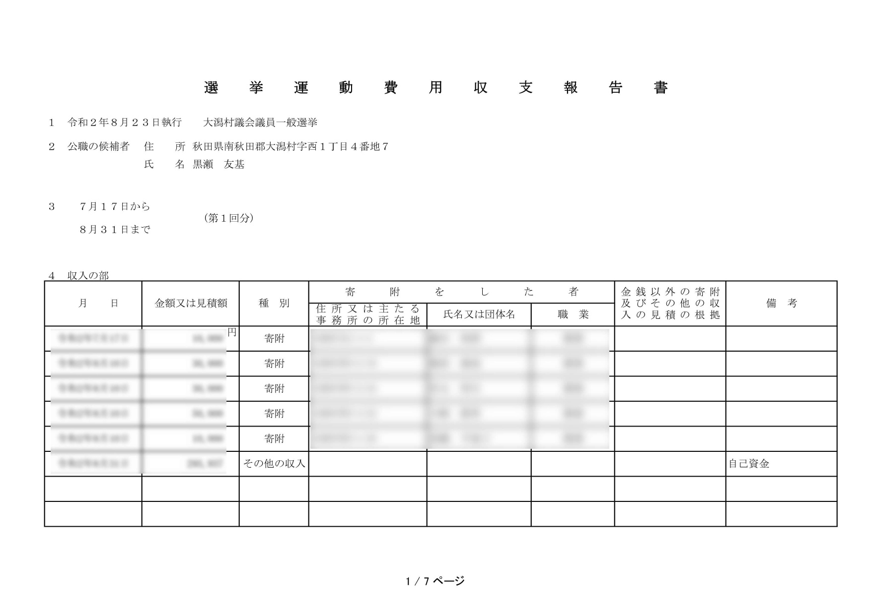 収支報告-選挙関連活動終了 選挙 2020.09.02 選挙が終わってから15日以内に選挙活動の会計報告を行う必要があり、今回は選挙会当日(選挙があった場合の投票日)から15日後の9月7日が期限ですが、本日、出納責任者と共に会計報告を作成して提出してきました。 無事に受理されて、これにて選挙に関する事務作業が終了しました。 寄付者の名前も載っているので一部伏せておりますが、要望があれば個別に開示します。また、役場(選挙管理委員会)でも閲覧可能です。