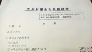 議会全員協議会 日々の活動報告(日記) 2020.09.10 2020.09.09 年4回の定例議会と必要に応じた臨時議会とは別に、定期的に全員協議会があり、初めて参加しました。 こちらは原則、毎月開かれるようですが、議会前の今回は、今回の議会に提出される案件の概要説明・質疑などが行われました。 ちなみに、議会前ではない場合は、その時点での村で行っている事業の説明などの情報共有、意見交換が行われるようです。 その後、議員、議会事務局のみでの議会日程・内容の打ち合わせ、議会以外の行事日程の確認など。 まだタブレットが届かないため、新人議員のみ紙での資料配布となってます。
