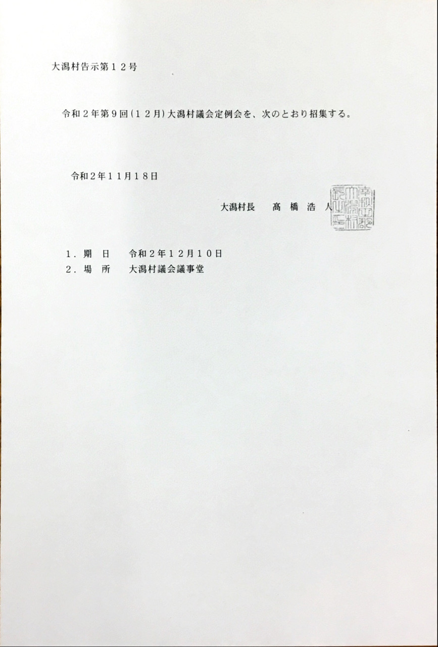 12月議会の日程が決まりました 日々の活動報告(日記) 2020.11.26 12月の定例議会の日程が決まりました。 定例議会は12月10日から翌15日ぐらいまでを予定しています。 一般質問は初日、総括質疑が2日目となる予定です。 年末でお忙しい時期かとぜひ傍聴にいらしてください。 ちなみに、議会は村長によって招集されるので、以下のような通知が届きます。(タブレットにですが)