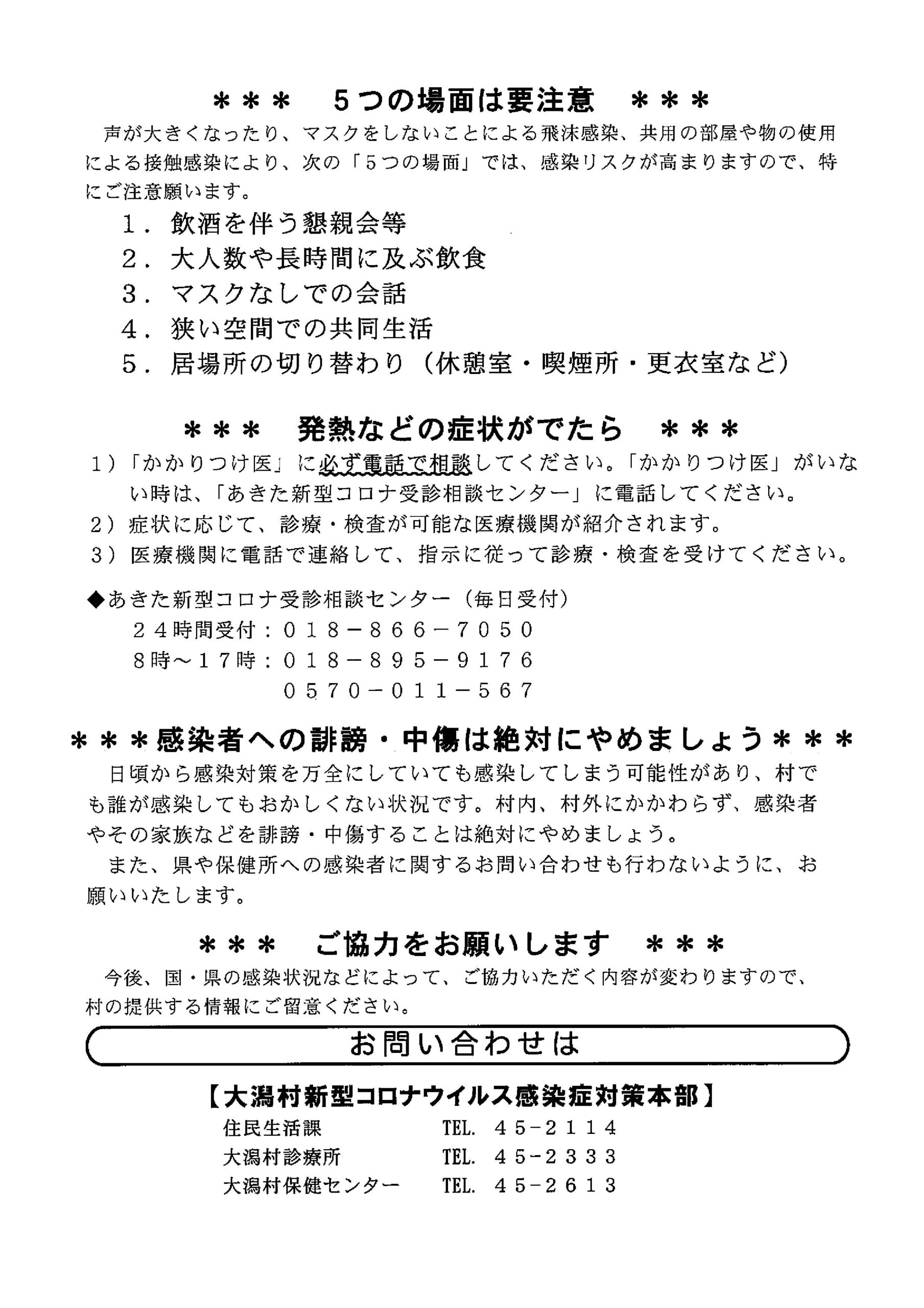 村の新型コロナ感染対策に関するチラシが全戸配布されたので載せておきます。