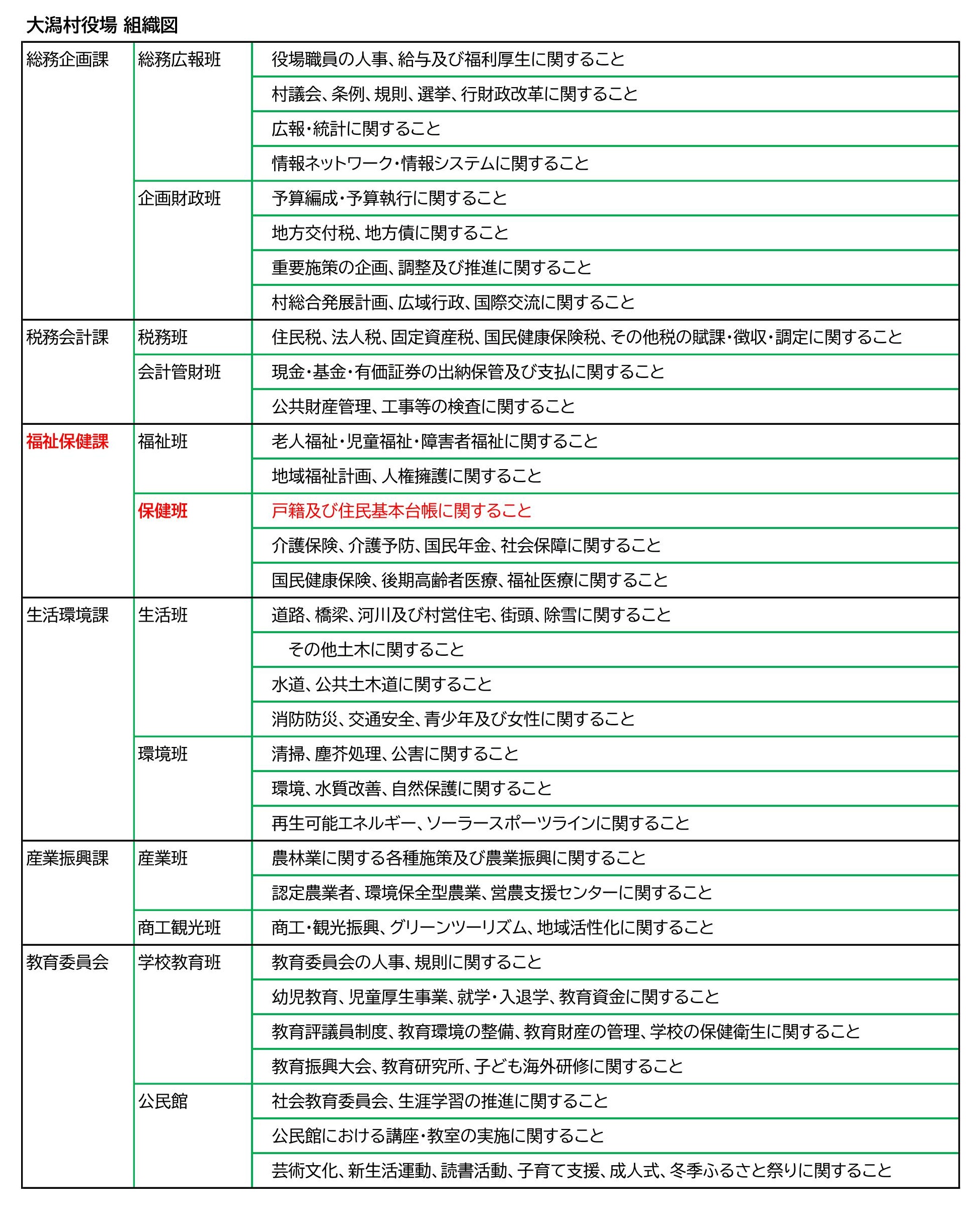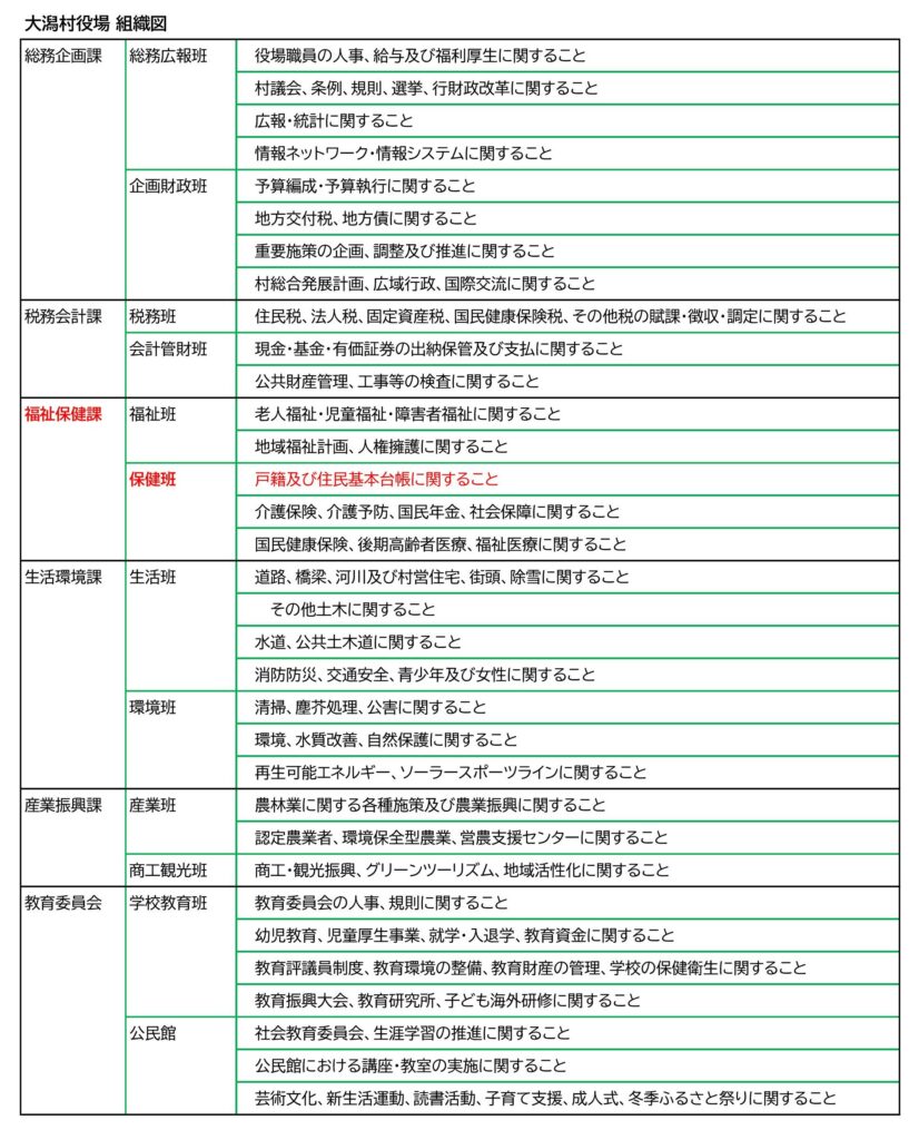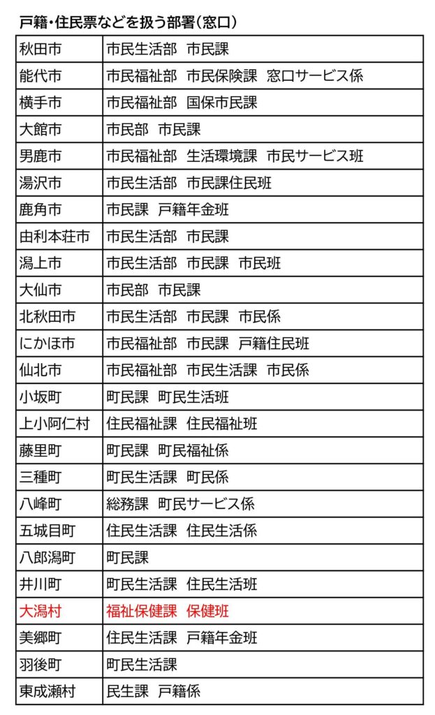 と言うことで、県内の全25市町村(大潟村含む)を調べてみたところ、大潟村以外で「住民(市民・町民)」を部署名に含まないのは、東成瀬村の「民生課」のみでした。