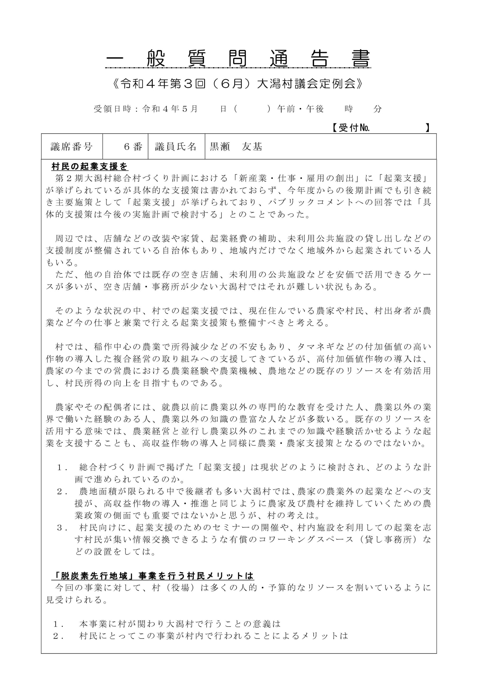 また、今回は5名の一般質問で、概要は以下の通りです。