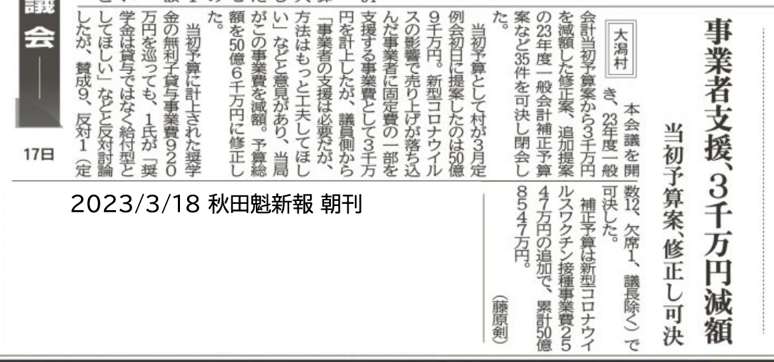「事業者支援の3000万を減額」となっていますが、過去3年行った同じ事業のうち約97%、つまりほぼ全額が村内の第三セクターに交付されています。