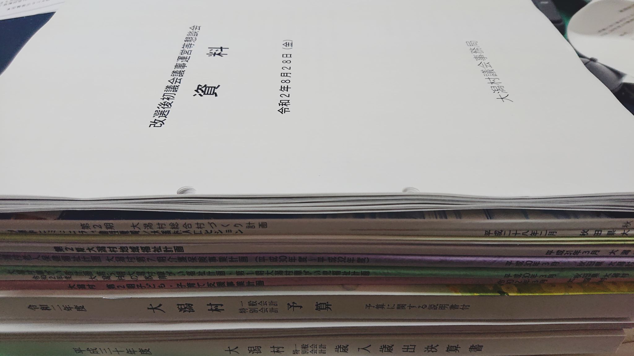 最初の定例会である9月議会は決算審議が中心のため、参考資料として前年決算書、今年度予算書、その他村の各種5か年計画などの計画書などをどさっ!っと頂いてきました。